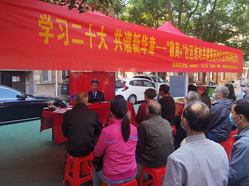 在商之都的各大商場內(nèi),電子屏循環(huán)播放著“學(xué)習(xí)二十大,永遠(yuǎn)跟黨走,奮進(jìn)新征程”“喜迎二十大,奮進(jìn)新征程“宣傳字幕。合肥中心廣場組織黨員、賣場主管以上人員、國生電器及紅府超市員工代表以集體唱紅歌、升國旗的形式慶祝黨的二十大勝利召開。總部黨支部、國生電器黨支部、合肥中心廣場黨支部黨員走進(jìn)三牌樓社區(qū),與社區(qū)黨委聯(lián)合開展了“學(xué)習(xí)二十大 共譜新華章——‘徽商+’社區(qū)結(jié)對共建暨新時代文明實(shí)踐活動”,和社區(qū)里的退休黨員群眾一起收看了二十大開幕盛況,并上門為省經(jīng)信委機(jī)械小區(qū)居民清洗空調(diào)。