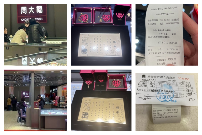 3月2日至3日,六安商廈周大福專柜迎來黃金銷售新突破,接連成交兩筆婚慶大額訂單,其中婚慶“三金”消費達7.56萬元,婚慶“五金”消費達10.28萬元。作為傳統(tǒng)婚慶消費的核心品類,“三金”“五金”接連斬獲大額成交,進一步豐富了門店銷售業(yè)績構(gòu)成,為全員沖刺一季度“開門紅”注入了強勁動力。