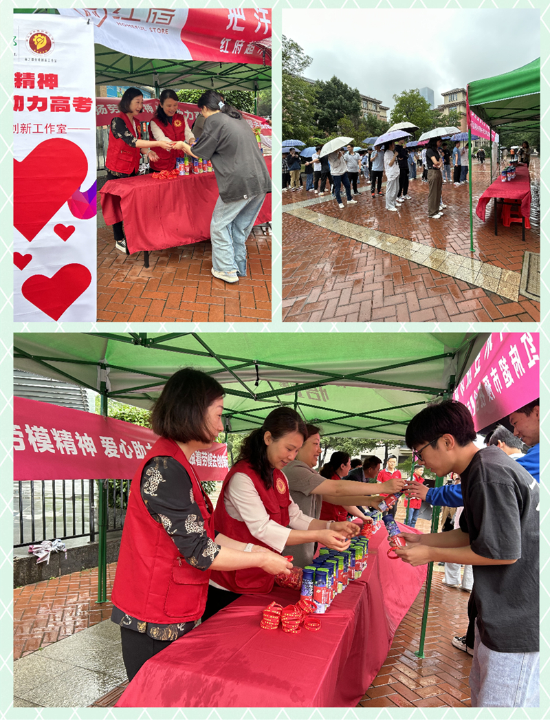 活動當(dāng)天,工作室準(zhǔn)備了1800份送考禮包,禮包內(nèi)是營養(yǎng)酸奶和加油手環(huán),希望通過點滴心意給學(xué)子們帶去一份營養(yǎng)和鼓勵。當(dāng)日,安徽省商之都工會主席孫益梅一同前往,帶去商之都給學(xué)子們的祝福,雖然大雨滂沱,工作室的成員們依然保持熱情,積極為學(xué)子們發(fā)放禮包,整個活動井然有序的進(jìn)行,充分展現(xiàn)了勞動模范新風(fēng)采。