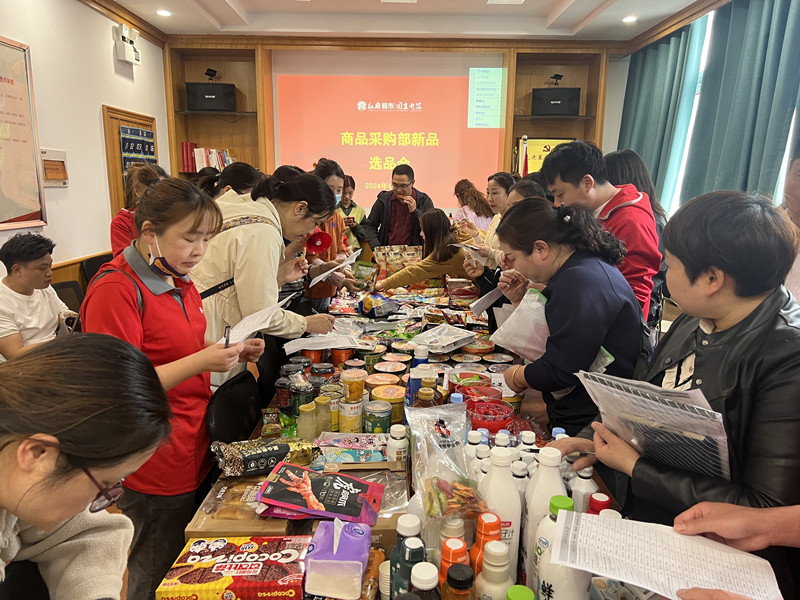 近日,紅府超市商品采購部召集各門店店長及相關(guān)部門人員在公司5樓會(huì)議室對(duì)擬引入的新品進(jìn)行品嘗、選品。