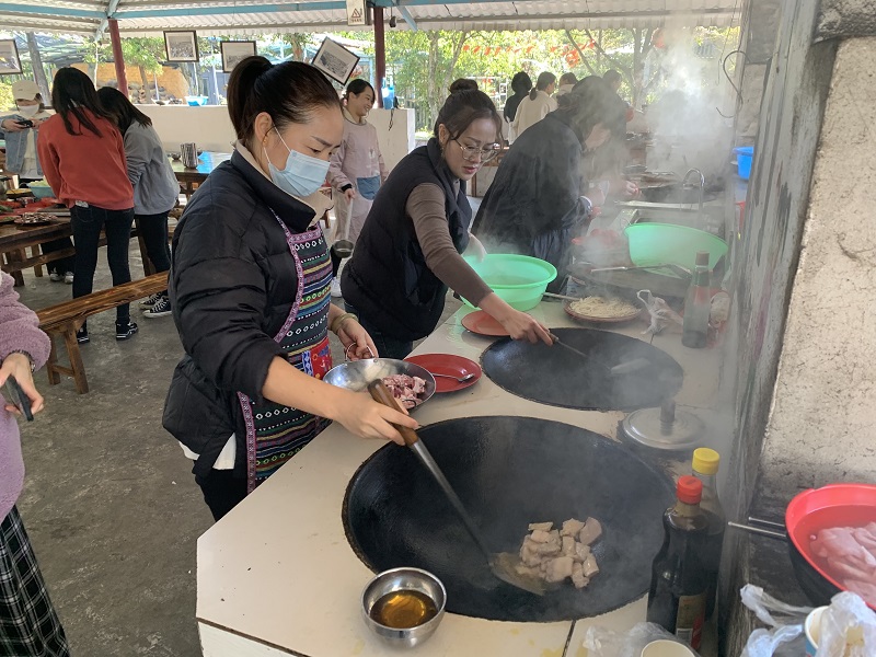 本次活動(dòng)分4個(gè)小組進(jìn)行比拼,每個(gè)小組在組長的帶領(lǐng)下烹飪美味。11月8日一大早,各個(gè)小組就帶著準(zhǔn)備好食材來到了紅村拓展基地。組長給每位組員分了工,組員們各司其職,洗菜、燒火,燒菜......忙得不亦樂乎,精心準(zhǔn)備午餐。比拼現(xiàn)場(chǎng)一片歡聲笑語,紅村上空炊煙裊裊,空氣中彌漫著大鍋灶的香味。