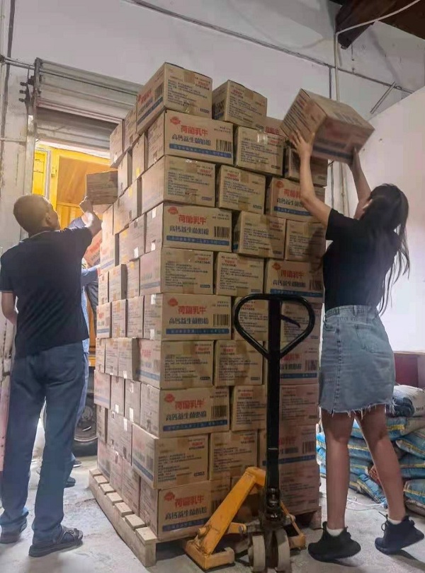 發(fā)貨當(dāng)天,大雨漂泊,為保障荷蘭乳牛奶粉快速裝車(chē)發(fā)貨,電商事業(yè)部的同事們冒著大雨全員上陣,共產(chǎn)黨員和積極分子擼起袖子帶頭干,事業(yè)部女同志們也未因包裝箱上的灰塵畏手畏腳,更未因貨物沉重而有所退縮,大家齊心協(xié)力,輪流上陣,糖酒事業(yè)部的同志們摩拳擦掌,搶著上前搬運(yùn)奶粉。在倉(cāng)儲(chǔ)人員、糖酒事業(yè)部和電商事業(yè)部同志的共同努力下,僅僅二十分鐘就將400件奶粉裝上滿(mǎn)滿(mǎn)一節(jié)廂式貨車(chē)。