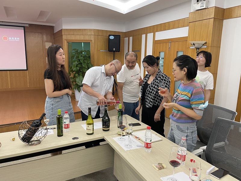 9月1日下午,徽商糖酒公司在五樓會議室舉辦紅酒銷售推廣品鑒會,邀請安徽江汽進(jìn)出口貿(mào)易有限公司銷售部長、江汽國際酒莊高級品酒師黃帥為徽商糖酒全體員工講解紅酒專業(yè)知識、禮儀、銷售技巧,并現(xiàn)場開展紅酒品鑒活動。