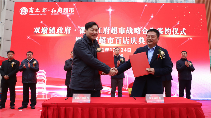 開業(yè)儀式前,雙墩鎮(zhèn)鎮(zhèn)長王世德與紅府超市董事長王正共同簽訂了戰(zhàn)略合作協(xié)議,雙方將聯(lián)手共同推動(dòng)合作向縱深發(fā)展,紅府超市將在雙墩鎮(zhèn)打造更多的鎮(zhèn)企合作示范店并加快紅府雙墩農(nóng)業(yè)基地建設(shè),為當(dāng)?shù)鼐用駧砀啾憷蛯?shí)惠。