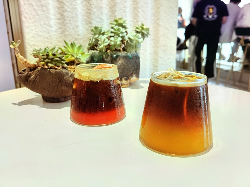 制作方法: 1、冰塊100克,切片香橙(西柚)貼壁;2、倒入橙汁(西柚汁)8分滿(A:橙汁——純凈水200克,冰塊50克,濃縮橙汁20ml,果糖20ml調(diào)勻。B:西柚汁——西柚果萃30ml,果糖20ml,氣泡水250克調(diào)勻);3、18克咖啡粉萃22-24克咖啡液緩慢淋入出品杯。補充:濃縮咖啡可在雪克壺中加入10克冰塊雪克一下,稀釋咖啡濃渡,更加突顯果味咖啡的分層感。