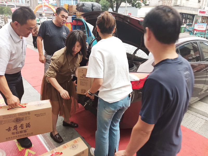 文字說明:商廈員工做了一筆酒水團購,正在給顧客送貨。