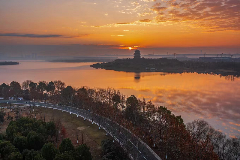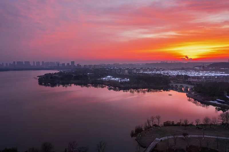 拍攝內(nèi)容:夕陽西下,滿天霞光,遠(yuǎn)處的敬亭山、宛陵閣、冬雪覆蓋的建筑與夕陽映照下的城市湖水,相映成輝,呈現(xiàn)出一幅幅精彩的畫卷。