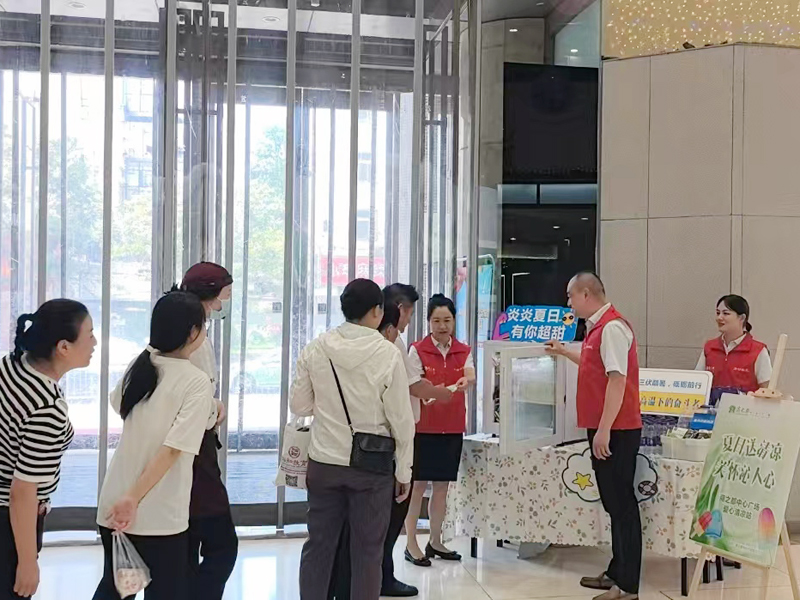 活動現(xiàn)場,志愿者們早早地忙碌起來,精心準(zhǔn)備了防暑藥品、冷飲、礦泉水等清涼物品。這些飽含著公司關(guān)心關(guān)愛的物品被逐一分發(fā)到每一位員工的手中。進(jìn)店的顧客也紛紛加入其中,領(lǐng)取清涼物品。大家臉上洋溢著幸福的笑容,內(nèi)心的喜悅溢于言表,紛紛表示感受到了中心廣場的溫暖。