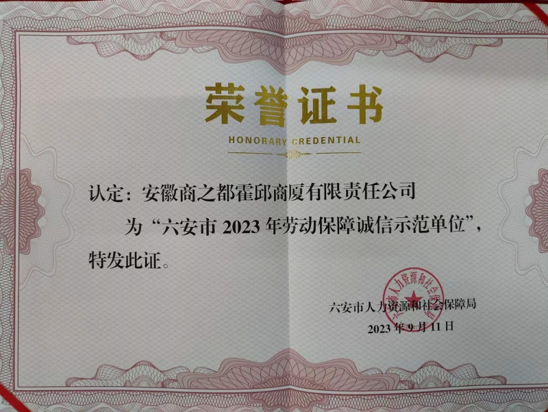近日,在六安市人力資源和社會保障局開展的2023年度勞動保障守法誠信等級評價工作中,霍邱商廈榮獲“六安市勞動保障誠信示范單位”榮譽稱號。