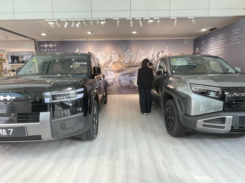 現(xiàn)場展臺設計別具匠心,以大氣的山水景觀為背景,搭配清晰醒目的品牌標識,營造出雅致且專業(yè)的展示氛圍。本次車站重點呈現(xiàn)了方程豹“豹8”“鈦7”等熱門車型,其中,售價定格在17.98萬-21.98萬元區(qū)間的鈦7車型,憑借硬朗大氣的外觀設計與明確的越野定位,成功吸引了眾多市民駐足觀賞、咨詢。為提升消費者體驗,展車旁特別設置了專屬洽談區(qū),便于市民近距離深入了解車型配置詳情及最新購車政策。